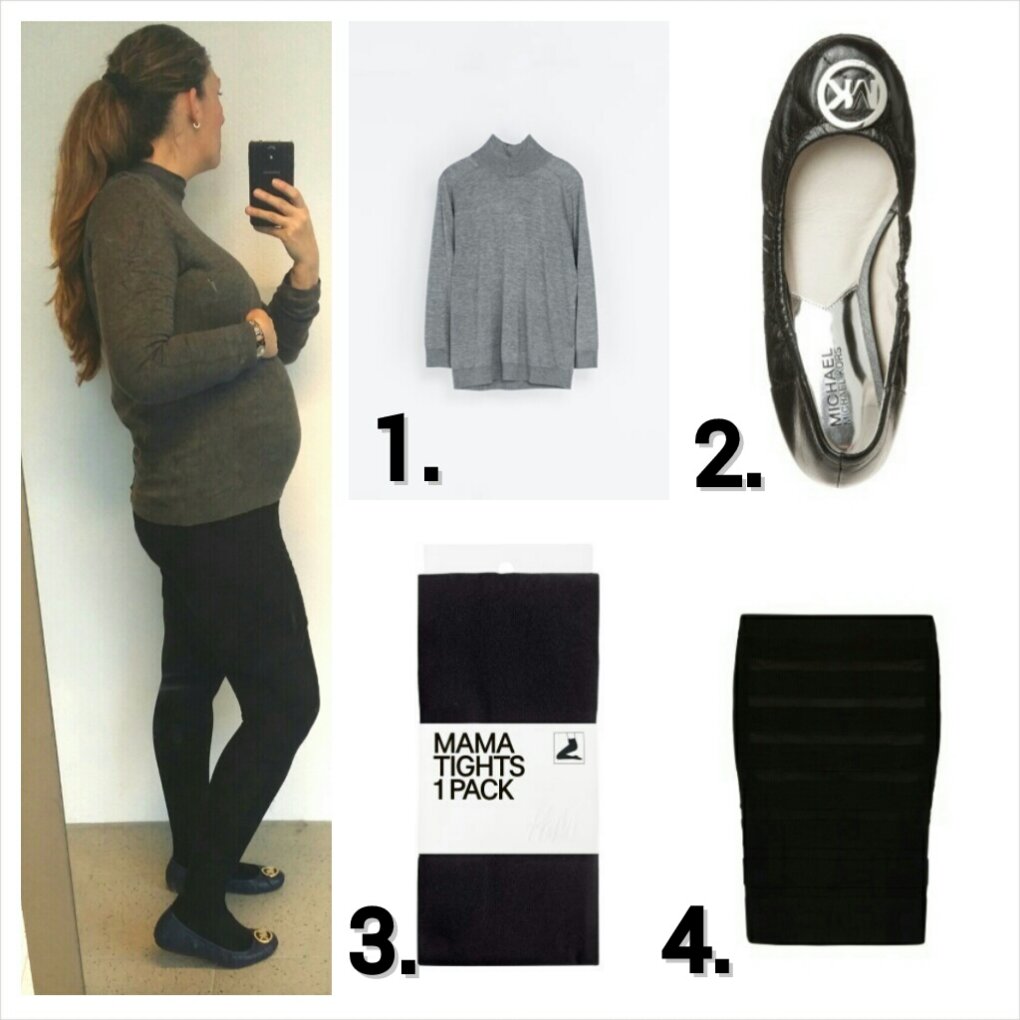 1. Grey sweater – zara 2. Flats – Michael Kors 3. Mommy tights – H&M 4. Pencil skirt – Mango