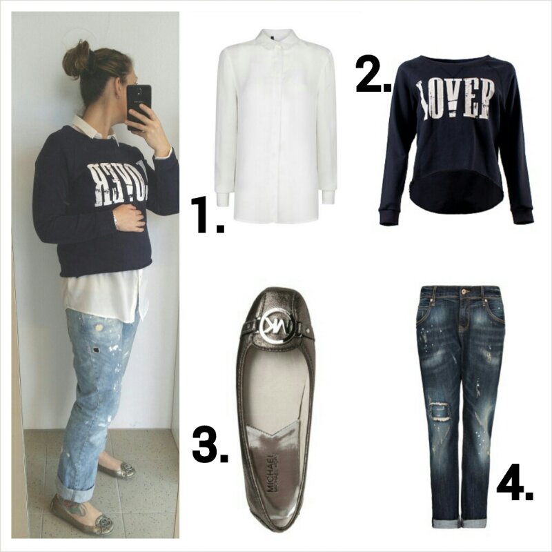 1. White blouse – Mango 2. Lover sweater – Jacky Luxury 3. Flats – Michael Kors 4. Boyfriend jeans – Mango