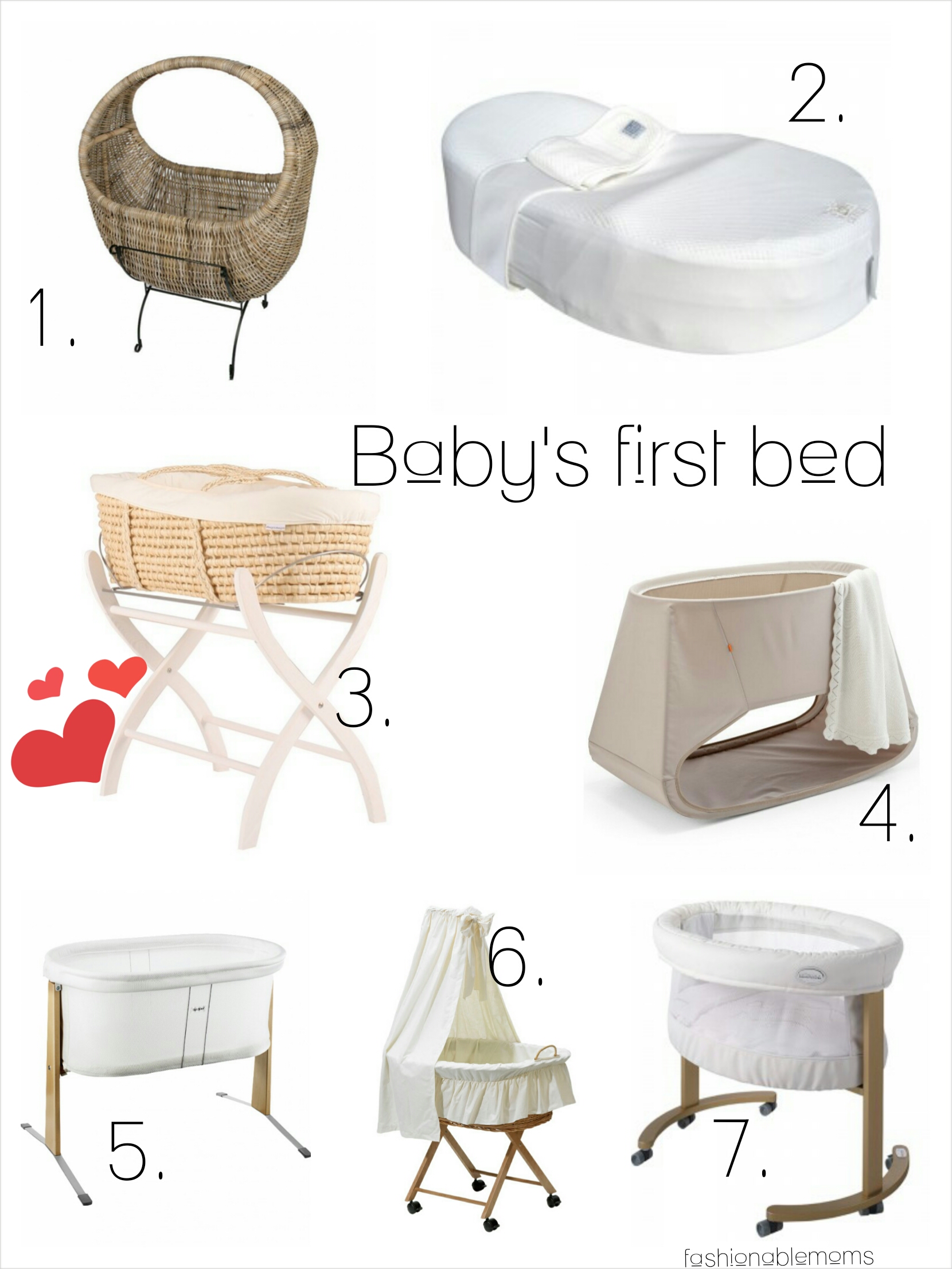 1. Celine cradle 2. Cocoon a Baby 3. Moses basket 4. Stokke Bounce 5. Babybjorn cradle 6. Leipold stubenwagen 7. Micuna oval cradle
