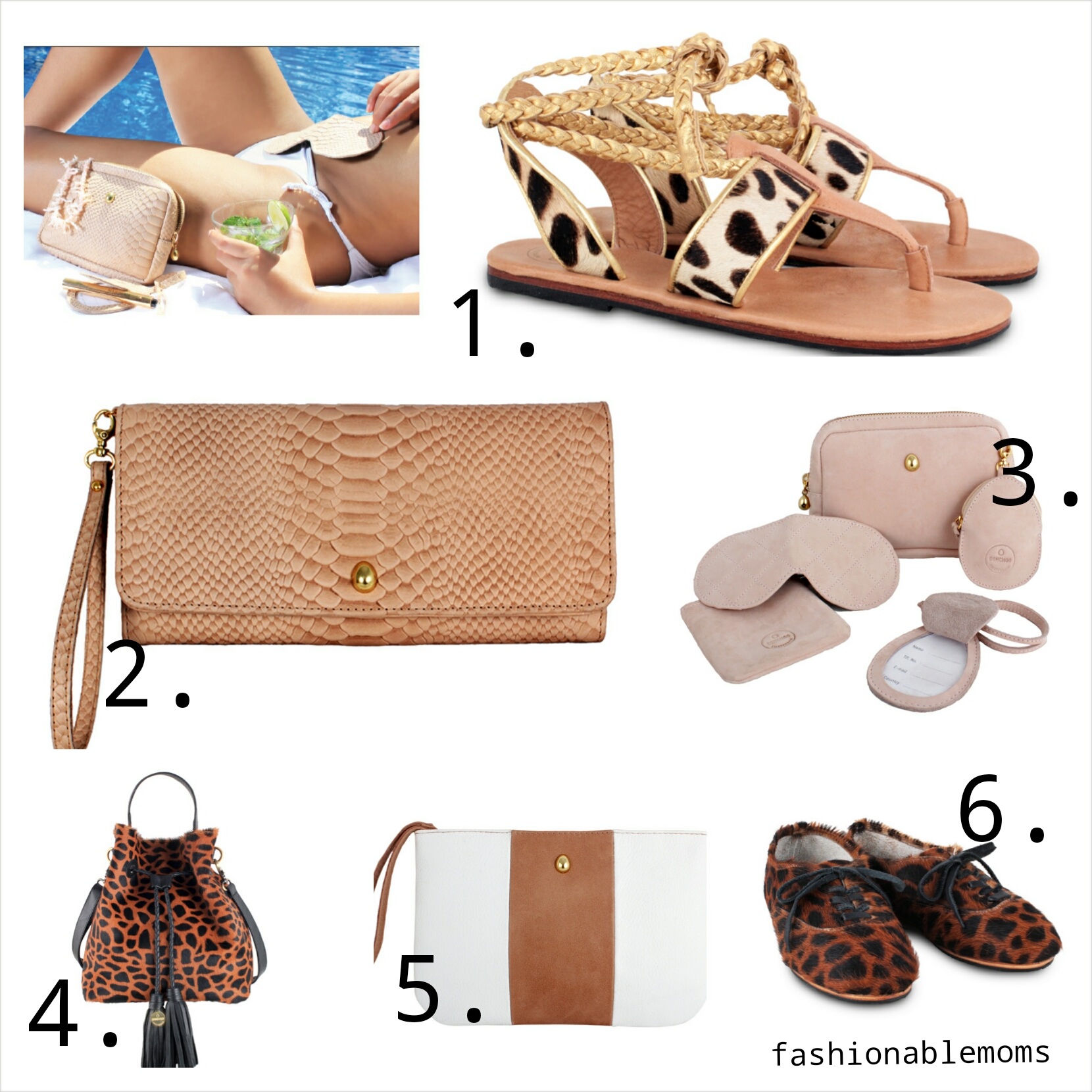 1. Bounty sandals 2. Joslyn wallet 3. Travel kit 4. Valeria bucket bag5. Bella clutch 6. Catharina flats