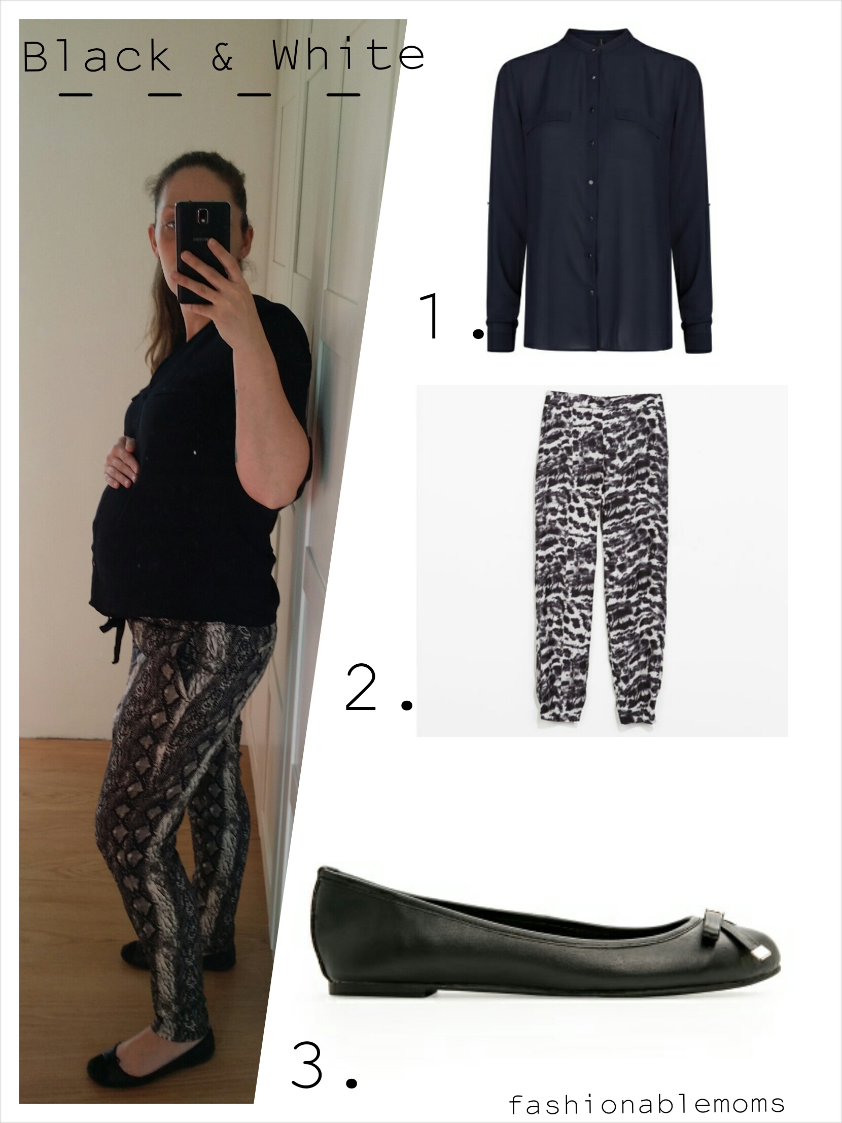 I’m wearing a snake print pants from last season from the Mango. It as an elastic band so I can wear it now even though I’m 34 weeks pregnant. Some flats and a nice blouse.