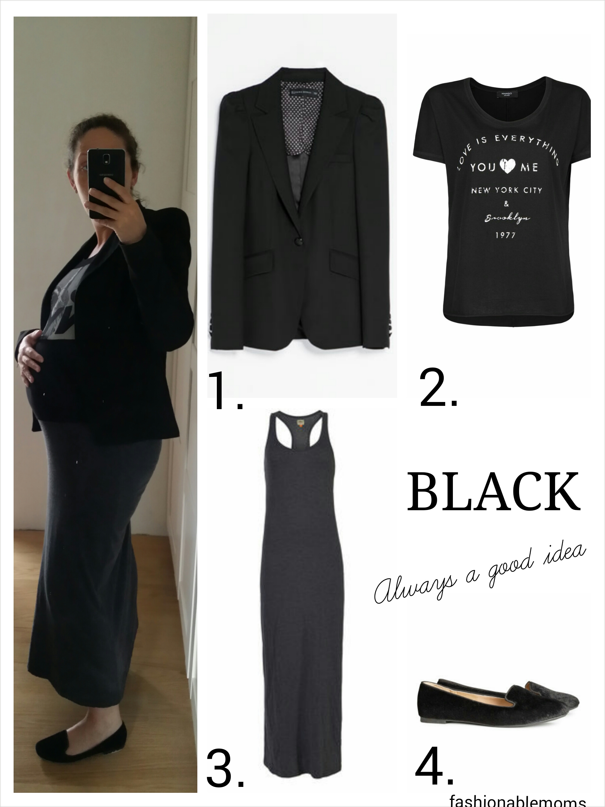 Because I don’t feel really comfy in pants anymore I bought this long dress and wear it like it’s a skirt. So I put a top over it and a blazer. The top I’m wearing is one from last year from the Mango. With a black and white NY print. And the blazer is also a oldy with high shoulders. They have a similar one at Zara now.