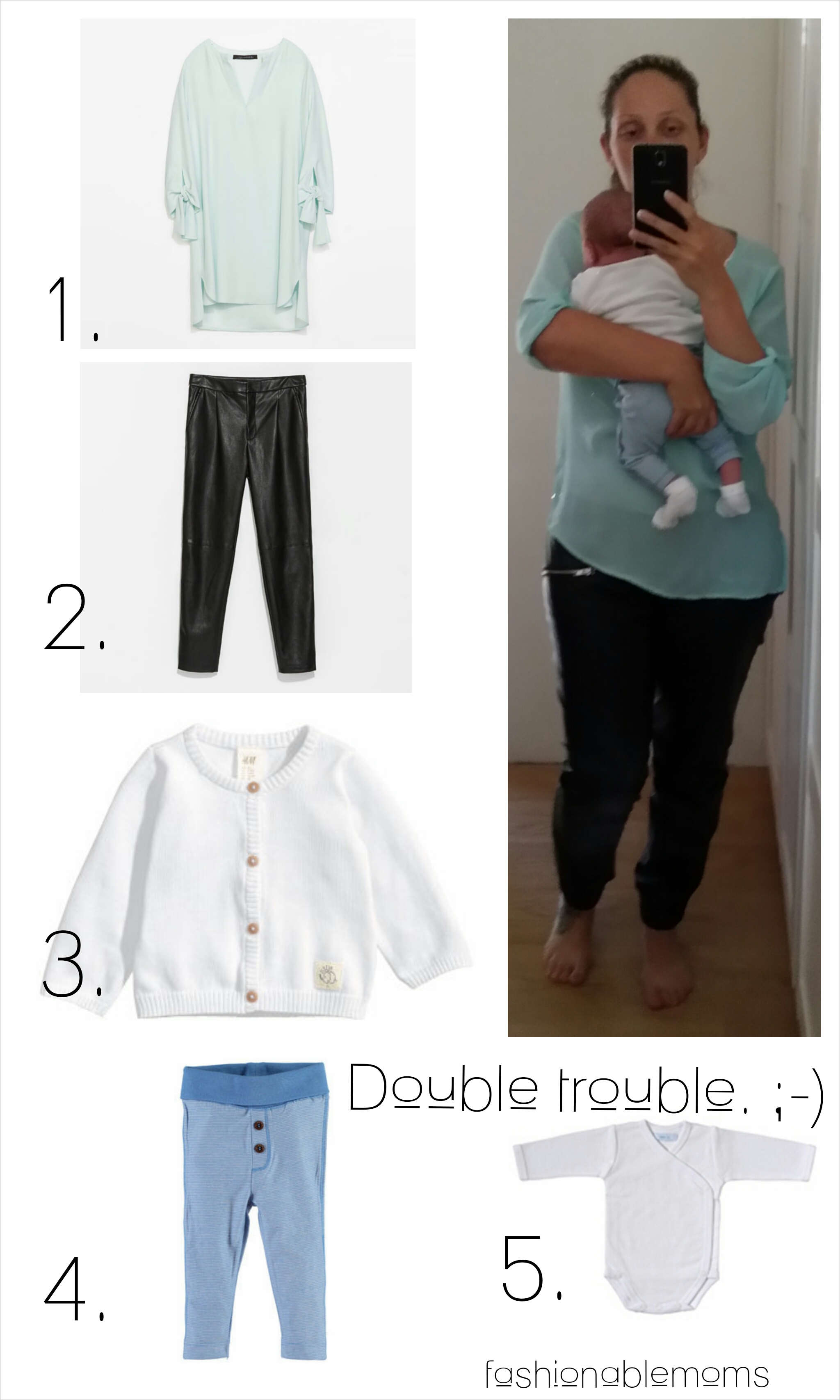 The first outfit post of Sam and me together. I’m wearing a faux leather pants from Zara and a mint green blouse. And Sam is wearing light blue/grey pants from Name it with a knitted vest from H&M. Name it is one of my favorite baby brands. they have comfy cute affordable clothes for baby’s.