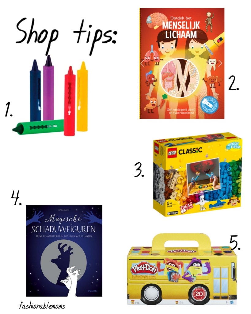 Haal alle lego uit de kast en pak de boekjes erbij en start met bouwen. Of zoek op pinterest lego bouw tips en probeer hele andere dingen te bouwen en niks geen boekjes te volgen. - Houd lekkere lang bad of douche sessies. Ook gewoon middag op de dag. Lekker alle speeltjes in bad of koop online een setje badkrijt. Gegarandeerd succes!