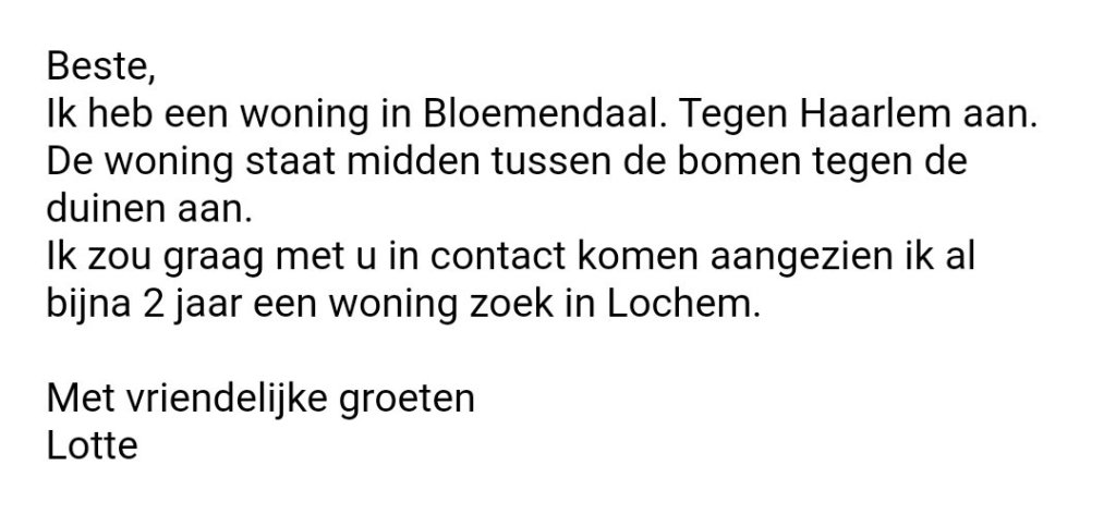 Dit was de reactie die ik stuurde op de advertentie op de woningruil site. Mijn verwachting was eigenlijk niet dat ik snel een reactie terug kreeg, helemaal niet omdat ik dit laat in de avond pas stuurde. Dus ik klapte mijn laptop dicht en dacht er eigenlijk niet meer aan.